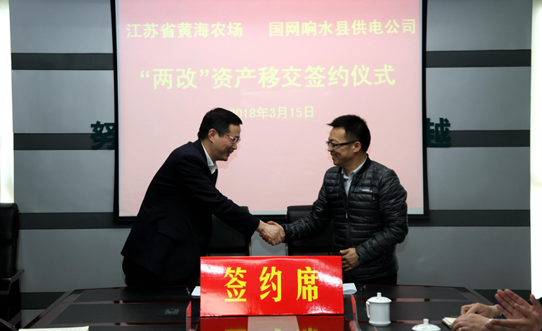 為貫徹落實國家和省委省政府及集團公司黨委關(guān)于加快推進農(nóng)場電力改造工作一系列決策部署,加快推進黃海電力“兩改”工作。3月15日,黃海農(nóng)場與國網(wǎng)響水縣供電公司電力“兩改”資產(chǎn)移交簽約儀式在響水縣供電公司舉行,標志著黃海電力“兩改”工作取得突破性的積極進展,進入職能接收、維修改造的實戰(zhàn)階段。黃海農(nóng)場黨委書記王亦勤、場長單祥忠、副場長薛亞林,響水供電公司黨委書記楊浩天、副總經(jīng)理沈曉東、王春雨共同出席簽約儀式。農(nóng)場和縣供電公司相關(guān)部室負責人參加了簽約儀式。