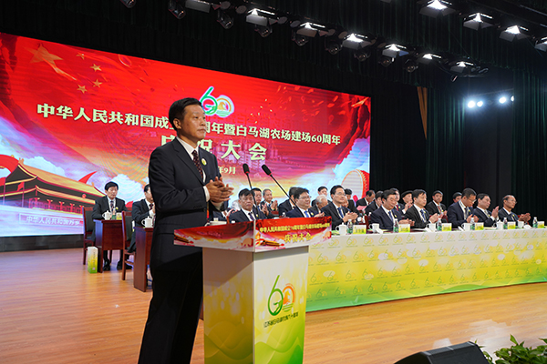 姚春華在致辭中代表農場公司黨委向60年來為白馬湖經濟社會發展作出貢獻的所有老領導、老知青、老職工,向所有為農場發展建設獻出寶貴生命的烈士親屬以及關心支持農場發展的社會各界人士致以崇高的敬意!向參加慶祝活動的集團公司領導,淮安區委、區政府、區人大、區政協領導,集團相關部室領導、區相關部委辦局領導、友鄰單位領導和墾區兄弟農場的領導,向參加慶祝活動的歷任老領導表示最熱烈的歡迎和衷心的感謝!