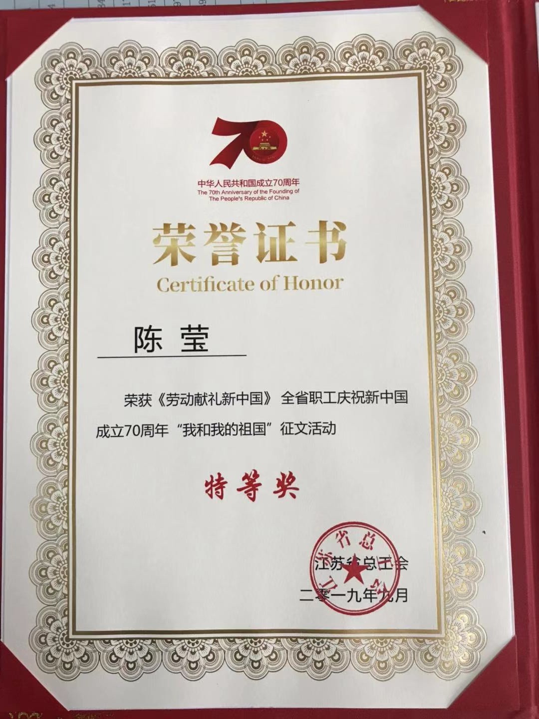 經農墾物業(yè)公司工會和集團工會推薦,物業(yè)公司職工陳瑩同志以《假如我有一臺時光機》一文參加《勞動獻禮新中國》全省職工慶祝新中國成立70周年“我和我的祖國”征文活動并榮獲特等獎。該活動共收到文稿5204封,特等獎10人,陳瑩代表江蘇農墾獲得榮譽。