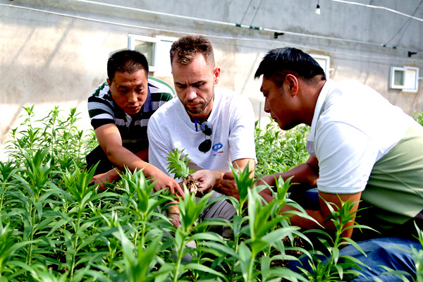 在崗埠期間,為進(jìn)一步了解連云港產(chǎn)區(qū)今年對(duì)其公司的商業(yè)評(píng)價(jià)和市場(chǎng)需求,更好地服務(wù)連云港市場(chǎng),對(duì)市場(chǎng)行情走勢(shì)做出新的評(píng)估 ,aad hendriks先后考察了崗埠高效農(nóng)業(yè)科技園、馨祥鮮花合作社百合花生產(chǎn)基地,現(xiàn)場(chǎng)調(diào)研百合鮮切花基地生產(chǎn)情況。Aad Hendriks重點(diǎn)考察了崗埠在百合花種植過程的土壤改良、耕地、整畦、種球規(guī)格、催芽技術(shù)、擺球深度、種植密度、科學(xué)施肥等各項(xiàng)技術(shù)操作流程,并現(xiàn)場(chǎng)指導(dǎo)花農(nóng)按規(guī)范進(jìn)行生產(chǎn)操作。