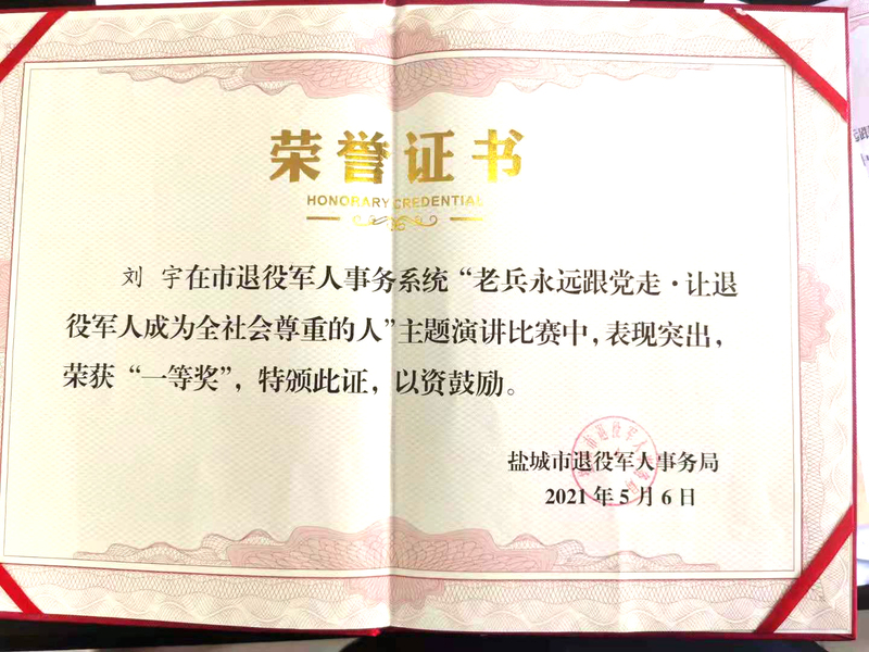 近日,農(nóng)場公司財務部青年員工——劉宇在鹽城舉行的“老兵永遠跟黨走·讓退役軍人成為全社會尊重的人”演講比賽中榮獲一等獎。