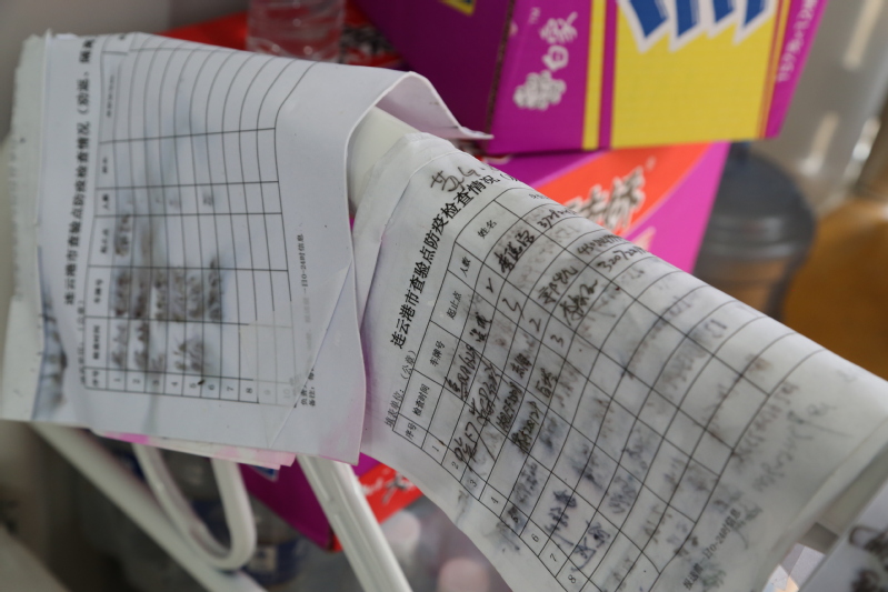 在王溝卡口點(diǎn),許多車輛信息登記表晾在床板上,當(dāng)你仔細(xì)一瞧會(huì)發(fā)現(xiàn),字跡不少已經(jīng)被雨水浸泡模糊。執(zhí)勤人員說,今天雨一直在下,但是執(zhí)勤力度不減,只好一邊登記一邊擦拭雨水。