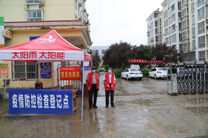 在景秀家苑小區(qū)門口,黨員先鋒崗的牌子格外顯眼,兩名黨員者愿者站的筆挺,堅(jiān)守在雨中。在振興花園小區(qū),執(zhí)勤人員對(duì)外來車輛進(jìn)行嚴(yán)格詢問登記,測(cè)量體溫。