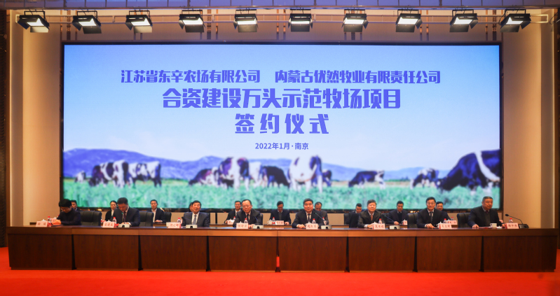 1月12日,東辛農場公司與內蒙古伊利集團優然牧業公司合資建設萬頭示范牧場項目正式簽約。本次簽約儀式采用視頻會議形式進行,省委農辦主任、省農業農村廳廳長楊時云,總畜牧獸醫師袁日進,集團公司黨委書記、董事長魏紅軍,總經理胡兆輝,副總經理姜建友、王立新,總法律顧問吳以國、總經理助理錢伯彬、董事會秘書孟亞平在南京出席儀式,伊利集團董事長潘剛,執行總裁張劍秋,副總裁劉剛、晁德文在呼和浩特出席儀式。袁日進、胡兆輝、張劍秋分別代表三方致辭,姜建友主持簽約儀式。