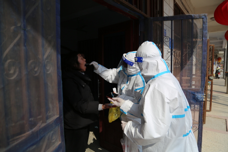 3月5日,連云港市海州區(qū)通報發(fā)生新冠肺炎疫情,形勢十分嚴(yán)峻。崗埠上下迅速行動起來,按照要求組織開展全員核酸檢測。全員核酸檢測要求一天內(nèi)對崗埠所有在家人員進(jìn)行檢測,農(nóng)場四個點(diǎn)位同時開始,負(fù)責(zé)檢測的人員特別緊張。馬素蓮得知這一情況,主動和相關(guān)人員溝通,暫停了自家門診,帶領(lǐng)醫(yī)生錢冬梅、護(hù)士錢明霞加入了振興廣場籃球場監(jiān)測點(diǎn)的核酸檢測人員隊(duì)伍。從3月5日到11日,她們?nèi)艘恢眻?jiān)守在核酸檢測一線,每天檢測人員合計(jì)達(dá)到兩三千人。有時候,她們需要配合網(wǎng)格員深入鎮(zhèn)區(qū)、生產(chǎn)區(qū)各居委會上門為行動不便的人員進(jìn)行采樣,足跡遍布大街小巷,密不透風(fēng)的防護(hù)服常常讓她們滿臉通紅透不過氣來。護(hù)士錢明霞告訴筆者,3月11日當(dāng)天,她負(fù)責(zé)部分小區(qū)的核酸采樣工作,光是6樓就爬了6次,腿最后跟灌了鉛一樣,挪不動。“有時候晚上嘴里吃著東西就睡著了。”