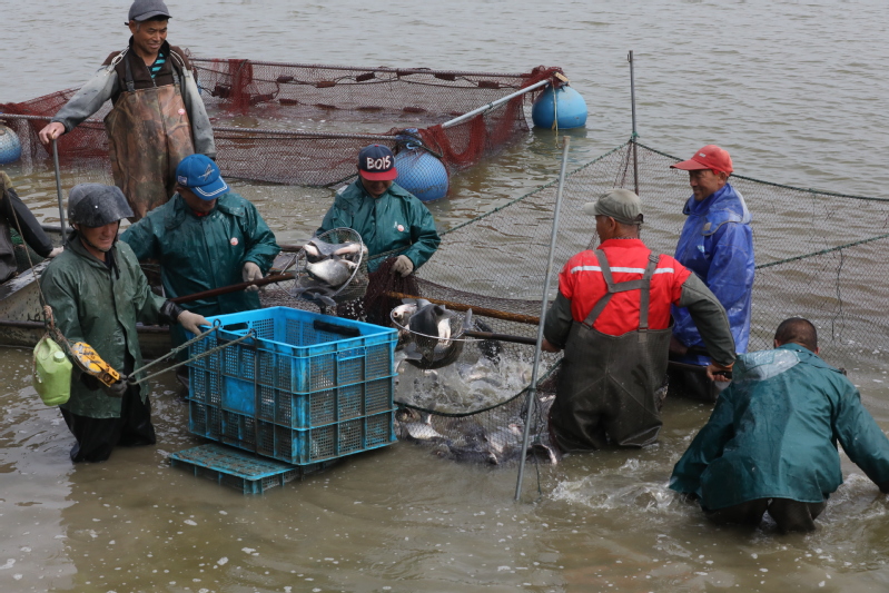 5月13日,寶應湖農場劉圩養殖場養殖戶楊金林正在起捕塘口鳊魚。