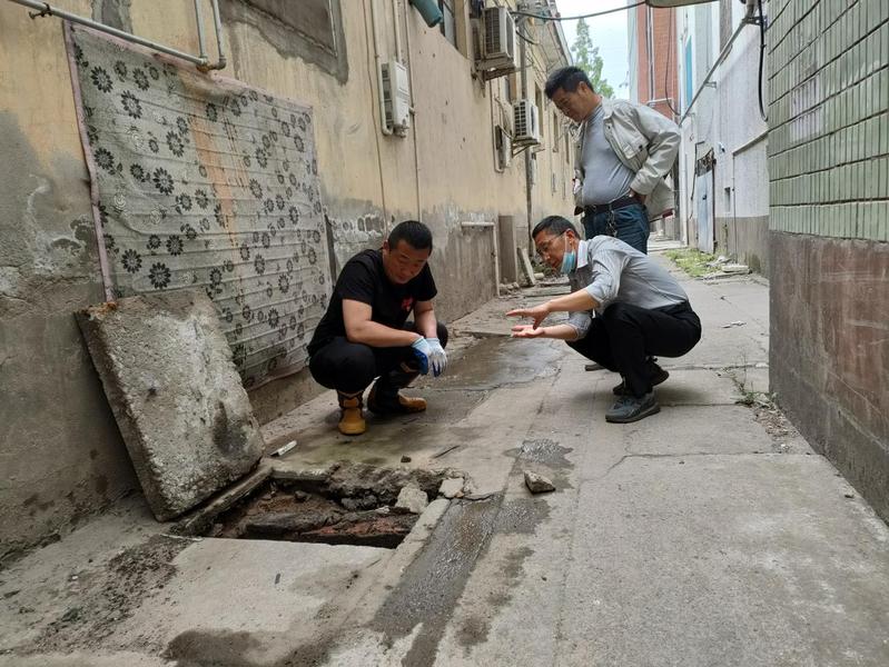 5月19日下午,新洋社區(qū)城西居委會黨支部書記蔡文良帶領(lǐng)黨員王強及居民組長一行在一號樓前面清理下水道。早在兩個多月前,一號樓就出現(xiàn)了下水管堵塞的現(xiàn)象,由于無人維修,堵塞問題日益嚴重,管道污水逐漸上漲,漫延到地面,妨礙了樓內(nèi)居民的進出。
