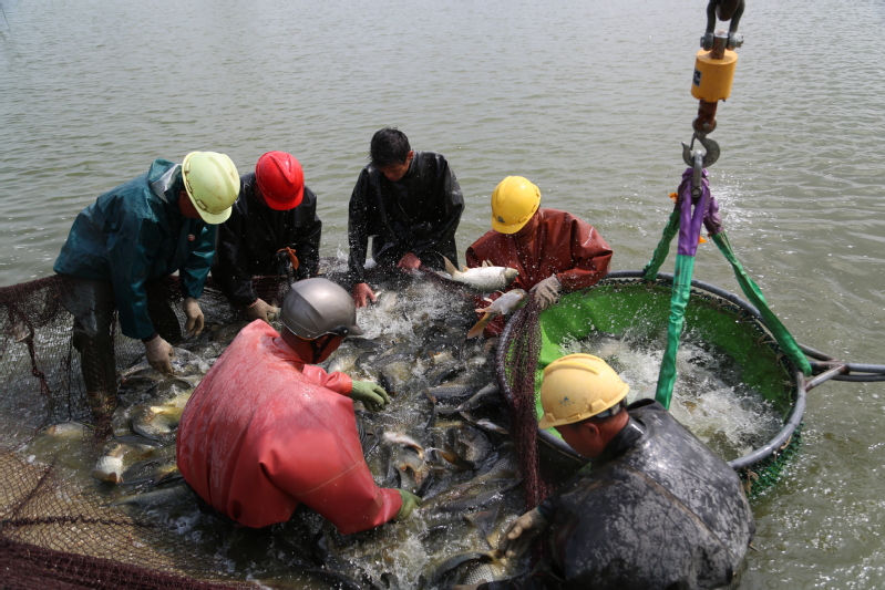初秋的早晨已然涼意十足,早上不到6點(diǎn),天剛蒙蒙亮,捕撈人員就來(lái)到魚(yú)塘開(kāi)網(wǎng)起魚(yú)。在水產(chǎn)公司工作人員的指揮下,一張巨大的漁網(wǎng)隨著捕魚(yú)工人的移動(dòng)緩緩張開(kāi),大家不顧冰冷的水下溫度,緊張忙碌了起來(lái)。經(jīng)過(guò)鋪底、收網(wǎng)、聚攏等環(huán)節(jié)的共同協(xié)作,漁網(wǎng)被慢慢升起……整個(gè)現(xiàn)場(chǎng)一片繁忙熱鬧景象。經(jīng)過(guò)近三個(gè)小時(shí)的忙碌,在大家的精心分揀下,裝滿魚(yú)的筐子被吊車有序吊起,稱重、記錄、放魚(yú)一氣呵成。“這個(gè)吊車頂部的黃色圓塊就是電子秤,吊起魚(yú)的同時(shí),秤上的信號(hào)就發(fā)到這個(gè)無(wú)線接收裝置上來(lái),秤重既方便又精準(zhǔn)。”現(xiàn)場(chǎng)記賬的方正解釋說(shuō)。
