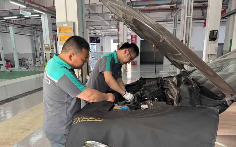 蘇舜舜江公司(上汽榮威、奇瑞星途4S店)技術經理潘學銀正在指導機電技師黃楠正在維修一輛因發動機故障導致無法正常行駛的車輛,黃楠說:“修車真的是一項需要經驗和技術的工作,每一次操作都是一次挑戰?!?/p>