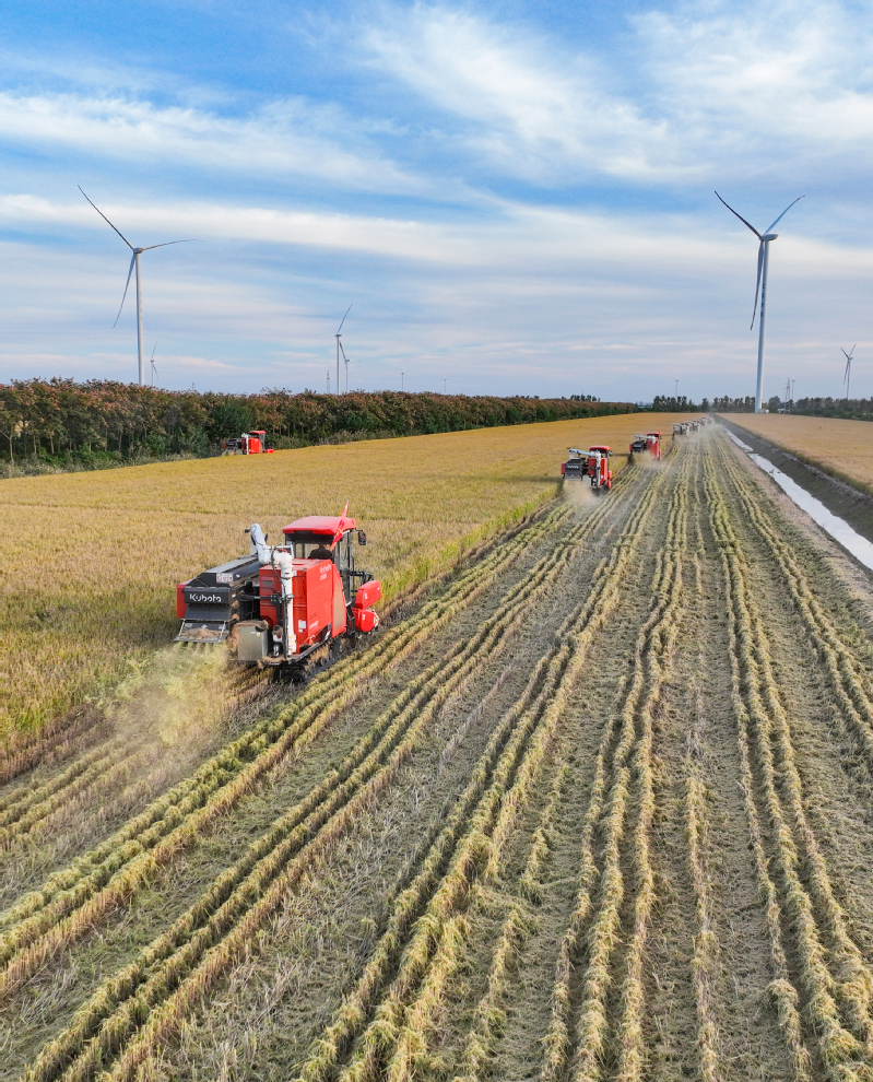 11月3日,江蘇省鹽城市射陽縣新洋農場組織收割機械,對高標準農田中的優質水稻進行搶收作業,確保秋糧顆粒歸倉,不誤農時。 作者:張偉生
