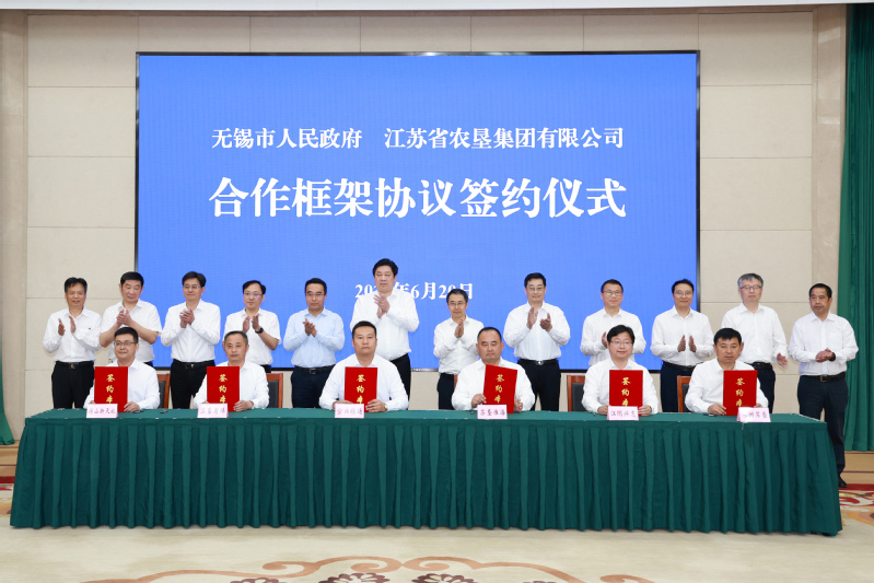 6月20日,集團(tuán)公司與無錫市政府簽署合作框架協(xié)議。無錫市委副書記、市長(zhǎng)趙建軍會(huì)見集團(tuán)公司黨委書記、董事長(zhǎng)吳本輝一行,并共同見證合作簽約。無錫市副市長(zhǎng)馬良,市政府秘書長(zhǎng)陳壽彬,集團(tuán)公司黨委委員、副總經(jīng)理王立新參加活動(dòng)。趙建軍對(duì)省農(nóng)墾集團(tuán)長(zhǎng)期以來給予無錫發(fā)展的關(guān)心支持表示感謝。他說,當(dāng)前無錫正深入學(xué)習(xí)貫徹習(xí)近平總書記對(duì)江蘇工作重要講話重要指示精神,認(rèn)真貫徹落實(shí)習(xí)近平總書記關(guān)于“三農(nóng)”工作的重要論述,大力實(shí)施鄉(xiāng)村振興戰(zhàn)略,全面推進(jìn)耕地保護(hù)“三提兩嚴(yán)”行動(dòng),加快農(nóng)業(yè)現(xiàn)代化建設(shè)步伐。希望雙方以此次簽約為契機(jī),充分發(fā)揮省農(nóng)墾集團(tuán)在發(fā)展現(xiàn)代農(nóng)業(yè)方面所具有的規(guī)模、資源、技術(shù)、裝備和管理優(yōu)勢(shì),圍繞土地流轉(zhuǎn)、規(guī)模種植和一體化全農(nóng)服務(wù)等領(lǐng)域加強(qiáng)產(chǎn)學(xué)研合作,攜手培育農(nóng)業(yè)新質(zhì)生產(chǎn)力,努力為保障國家糧食安全、推進(jìn)鄉(xiāng)村全面振興貢獻(xiàn)更大力量。同時(shí),期待雙方不斷拓展在醫(yī)藥健康、生態(tài)環(huán)保、房地產(chǎn)等方面的合作空間,在更寬領(lǐng)域、更深層次實(shí)現(xiàn)互利共贏。吳本輝在簡(jiǎn)要介紹集團(tuán)生產(chǎn)經(jīng)營情況后表示,無錫農(nóng)業(yè)強(qiáng)、農(nóng)村美、農(nóng)民富,“魚米之鄉(xiāng)”底蘊(yùn)深厚、盛名遠(yuǎn)揚(yáng)。他說,近年來省農(nóng)墾集團(tuán)深入學(xué)習(xí)貫徹習(xí)近平總書記關(guān)于農(nóng)墾工作重要論述,認(rèn)真落實(shí)省