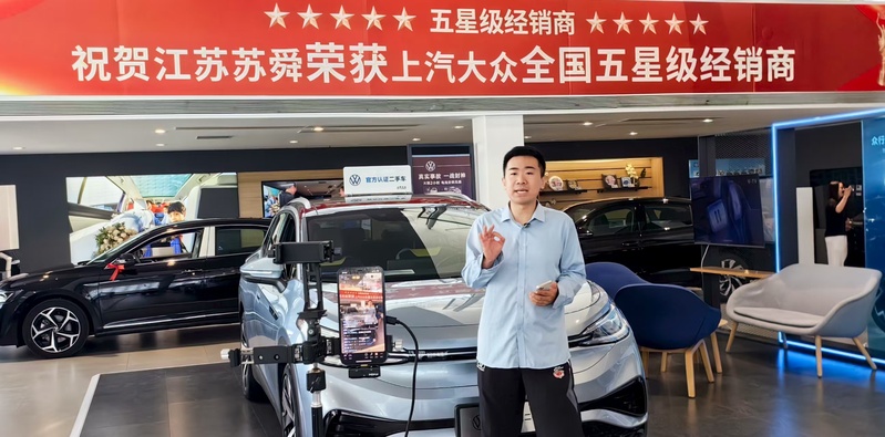 蘇舜公司創新“直播+服務”銷售模式,重點發力“抖音、小紅書”等平臺,加大直播場次與粉絲互動,將留資轉化率提升至12%,平均觀看時長達到23分鐘。圖為工作人員在直播間提供二手車在線置換評估、金融方案計算等服務。